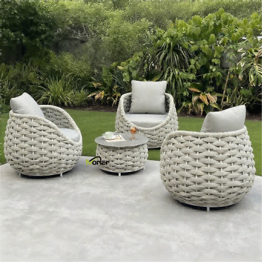 4. Açıq divan: Əl ilə örgülü ip dizaynı vizual olaraq yüngül və nəfəs alır və alüminium çərçivə müasir bir toxunuş əlavə edir. Rahatlıq və sənətkarlıq birləşdirərək, mürəkkəb bir balkon yaratmaq üçün məşhur bir seçimdir.