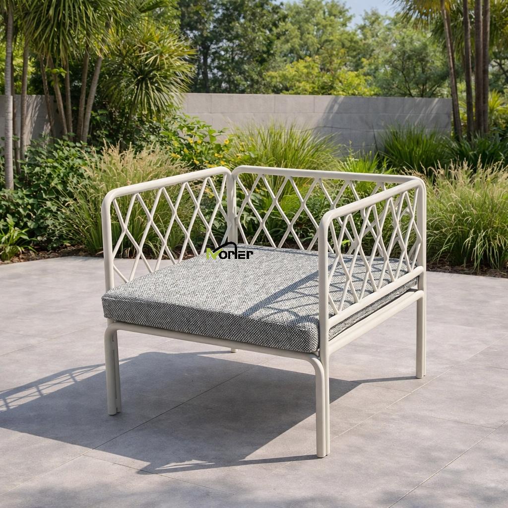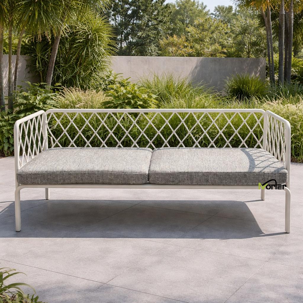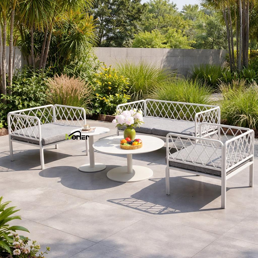 Bu müasir açıq divan dəsti gözəl hazırlanmış həndəsi metal çərçivə ilə təmiz və minimal dizayna malikdir. Açıq qəfəs strukturu güclü struktur dəstəyini qoruyaraq yüngül və zərif görünüş yaradır.